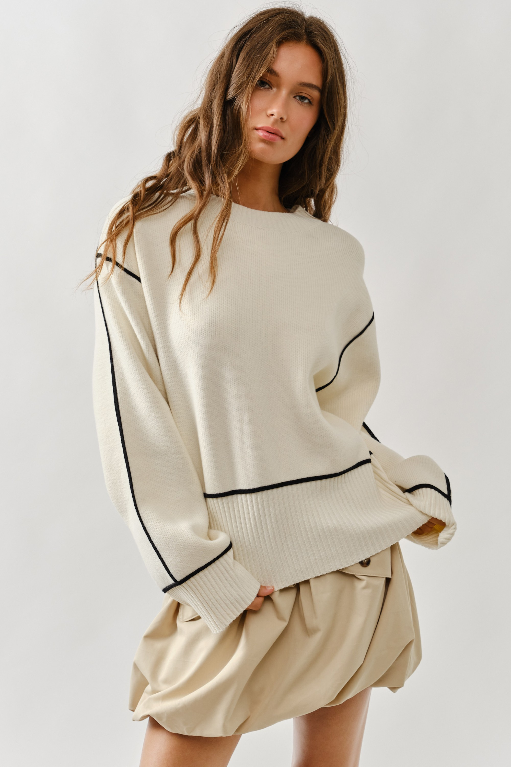 The cutest sweater! fits a little loose and looks great with jeans and skirts! Iβm usually between a S/M and went with the small.