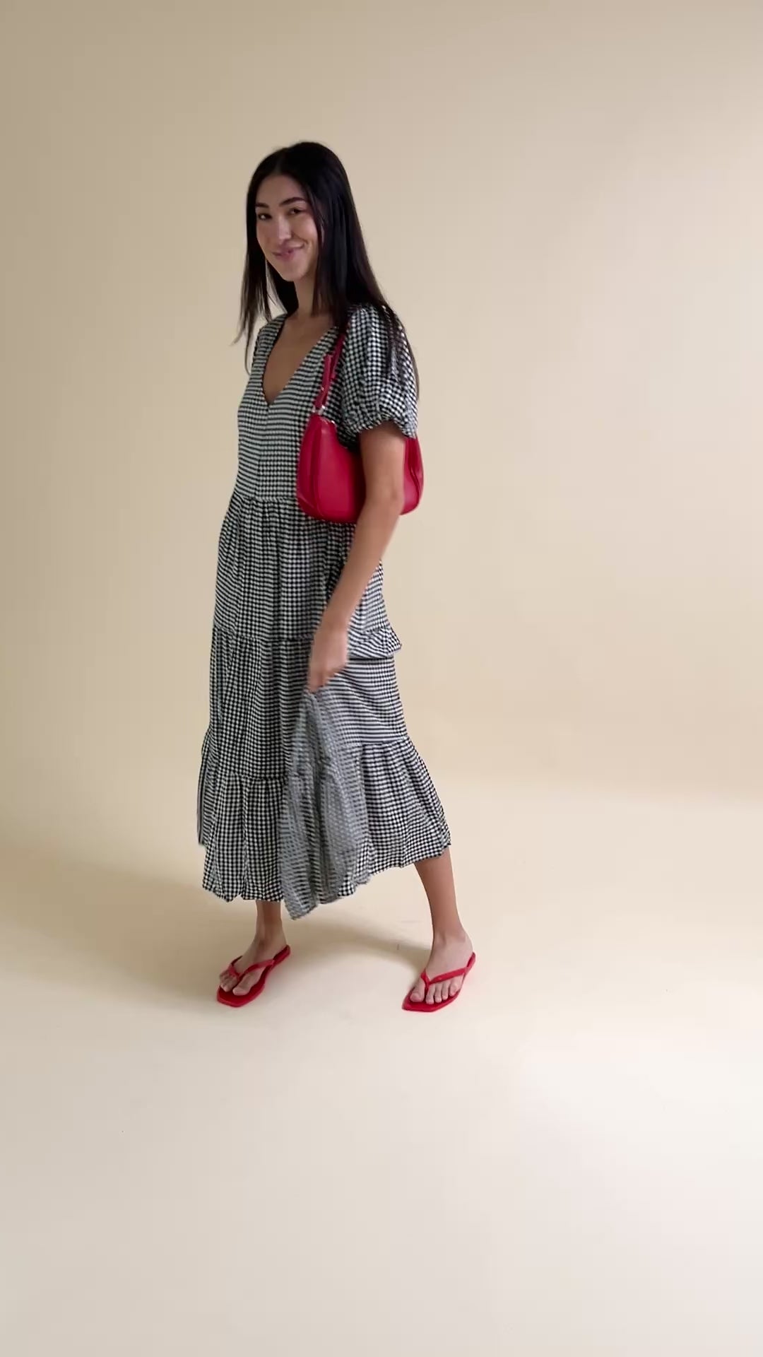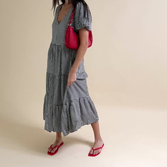 Gingham, open back, tiered midi dress with short puff sleeves and an elastic cuff. Features three back functional buttons and a smocked back waist for added comfort. Functional side pockets included. Linen blend.