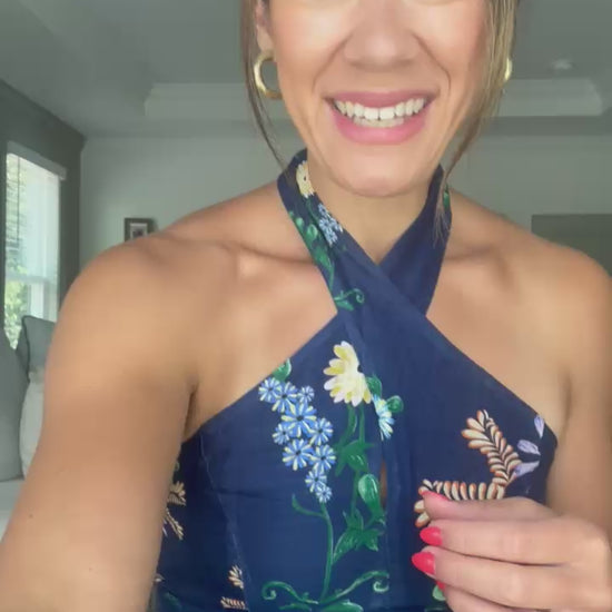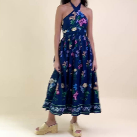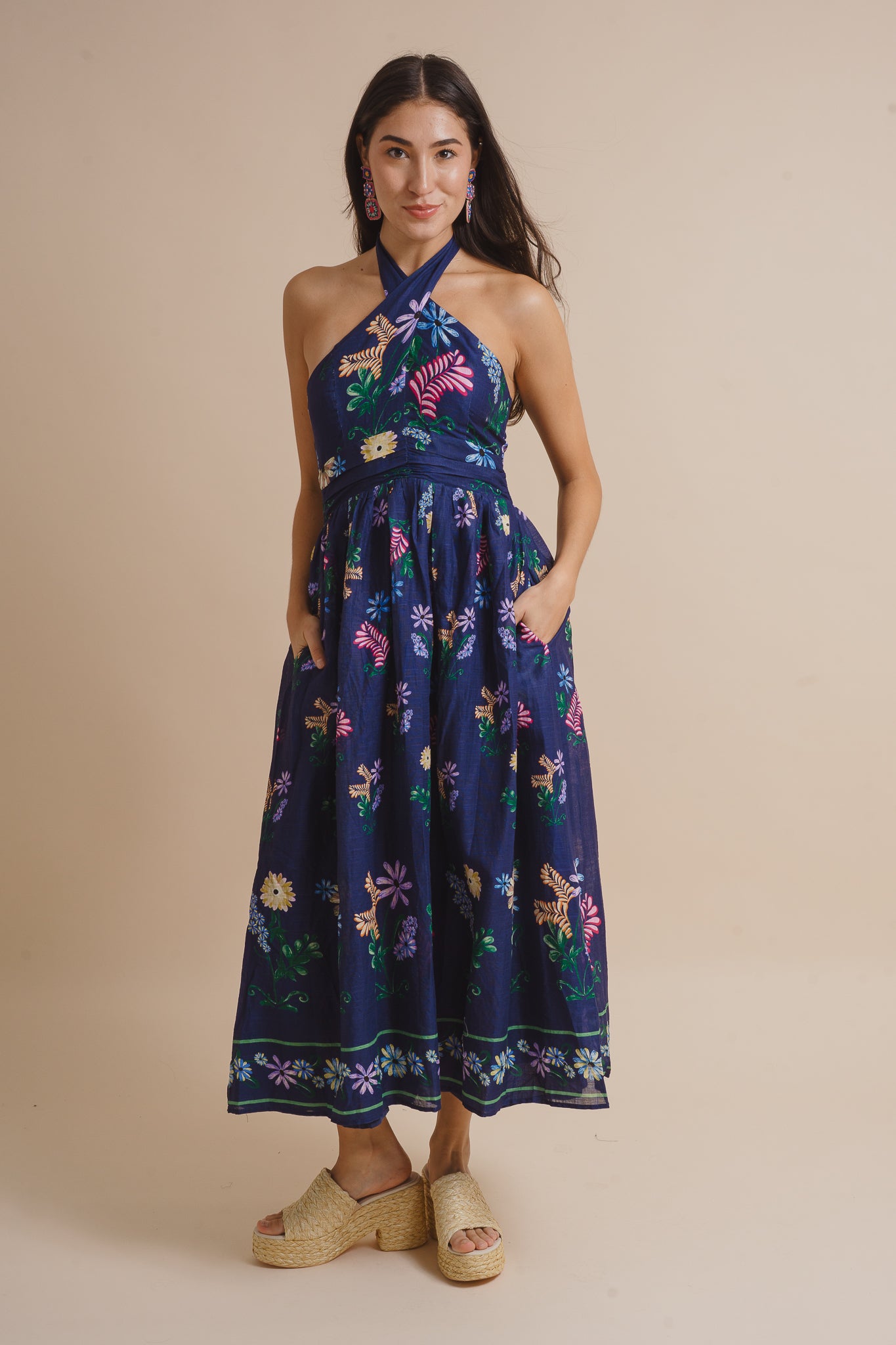 Step into sophistication with our Helena Floral Maxi Dress. Crafted with meticulous attention to detail, this dress embodies the perfect blend of contemporary charm and classic allure. Its rich navy palette, adorned with vibrant floral prints, makes it an ideal choice for prestigious gatherings or high-end social events.