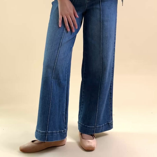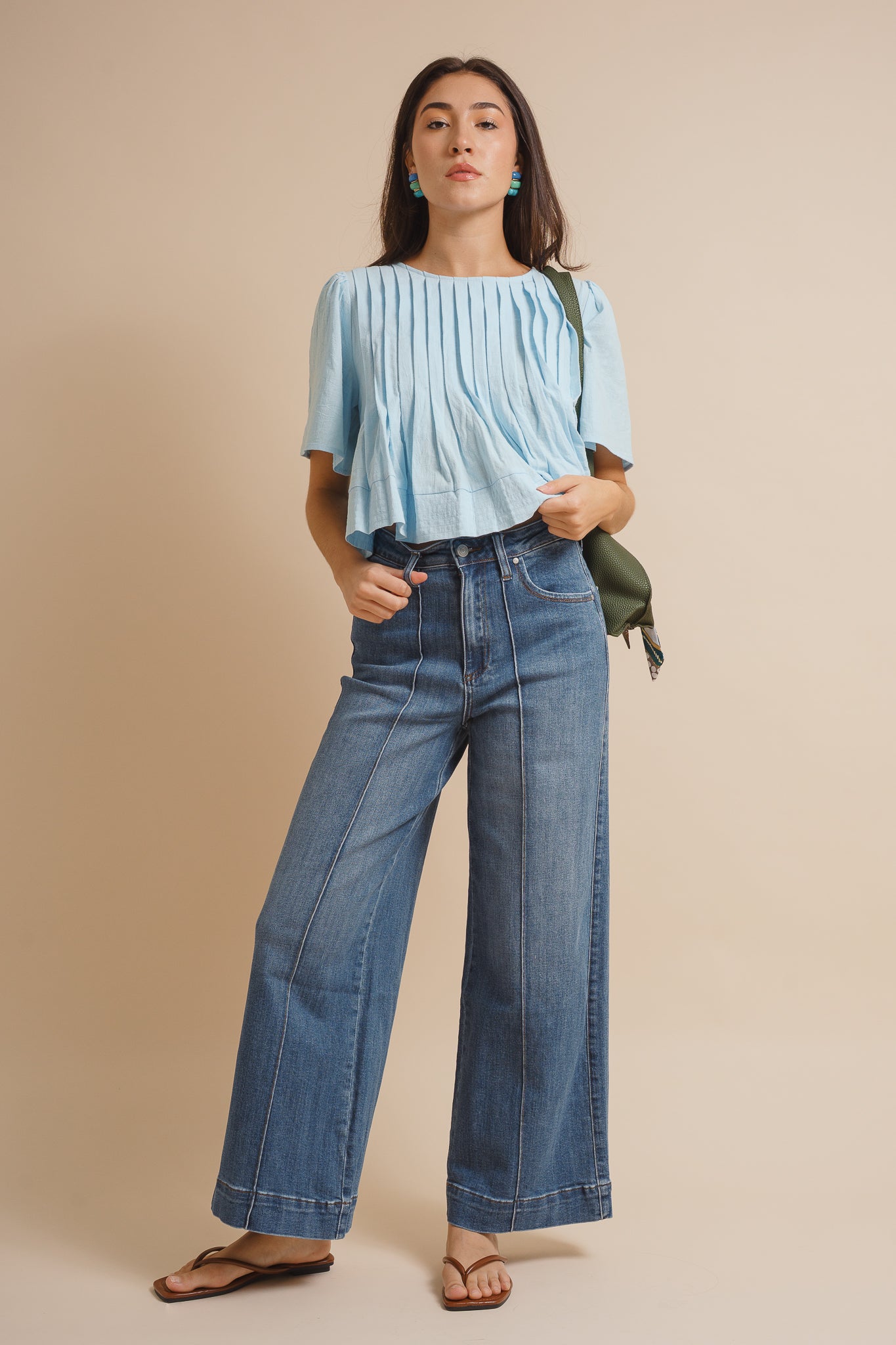 Stretchy High Rise Pin Tuck Detail Wide Leg Jean