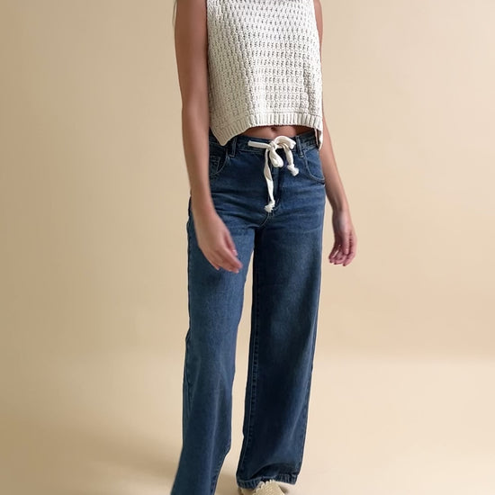 Effortless comfort meets laid-back style in these drawstring waist straight-leg jeans. Crafted from soft, medium-wash denim, they feature a relaxed fit with a bottom fly closure and an adjustable drawstring waist for a customizable fit. The wide, straight-leg silhouette offers easy movement.