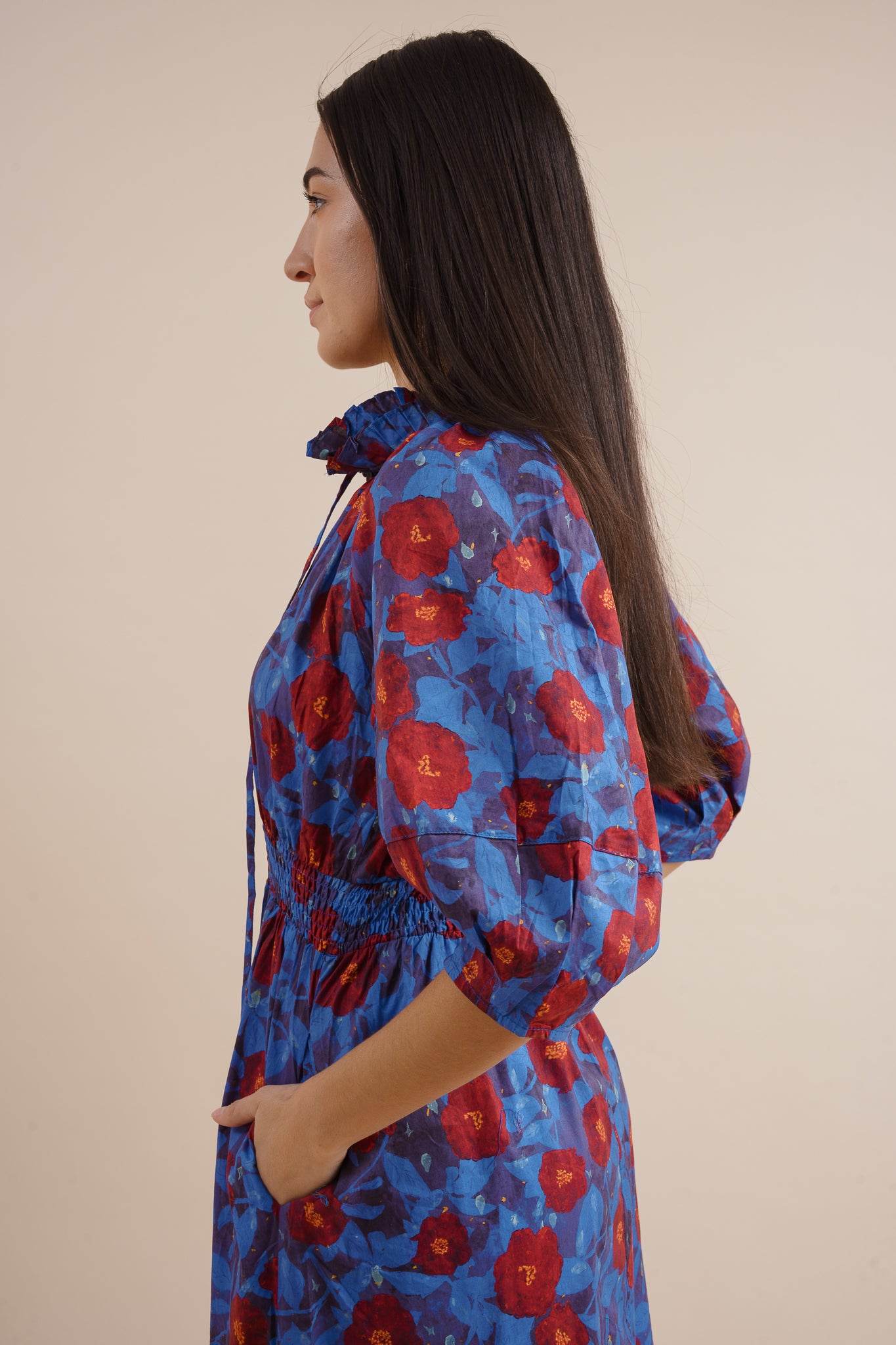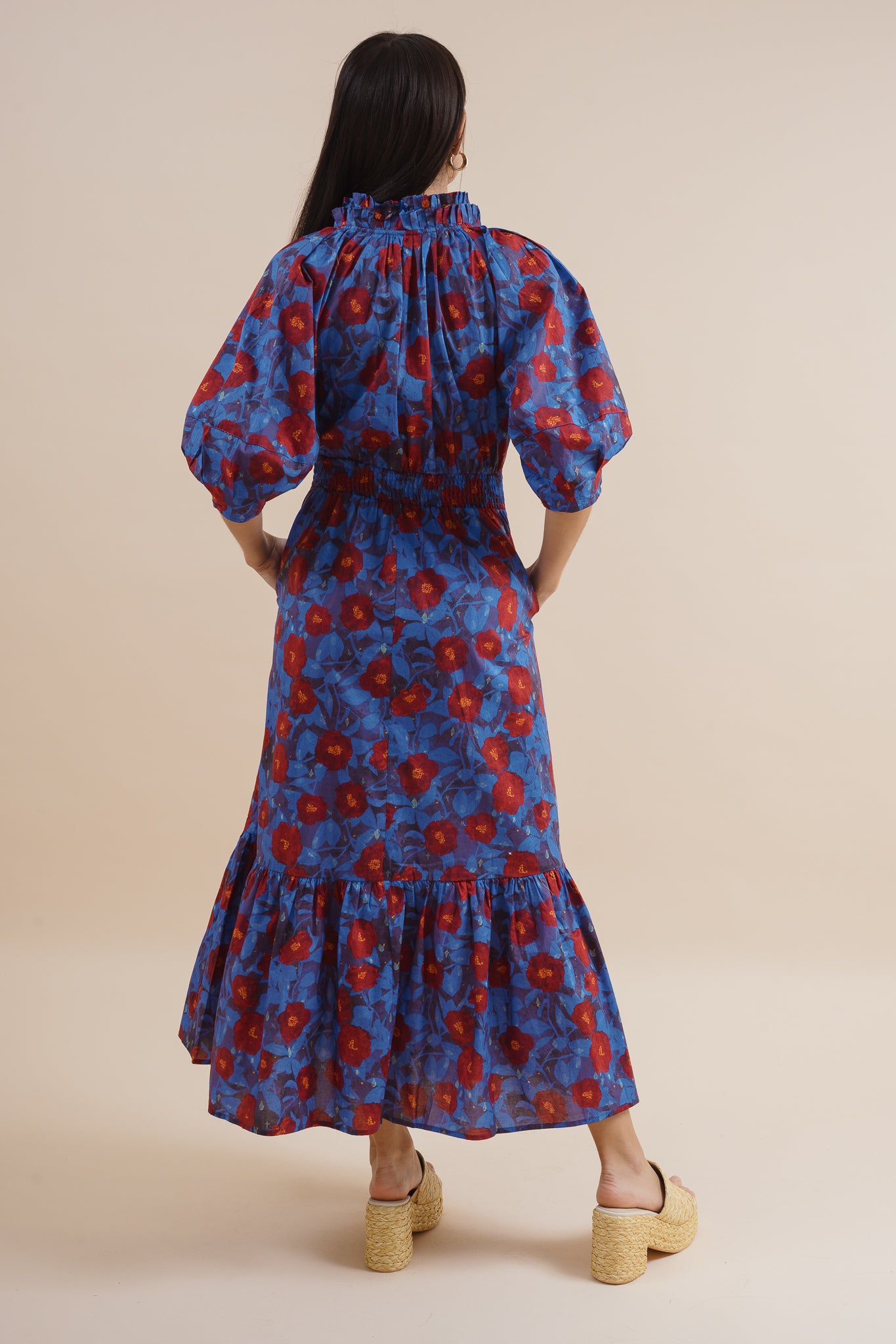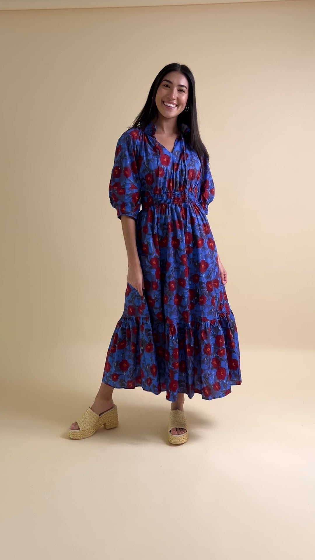 Floral print ¾ lantern sleeve tiered pullover midi dress featuring smocked waistband.