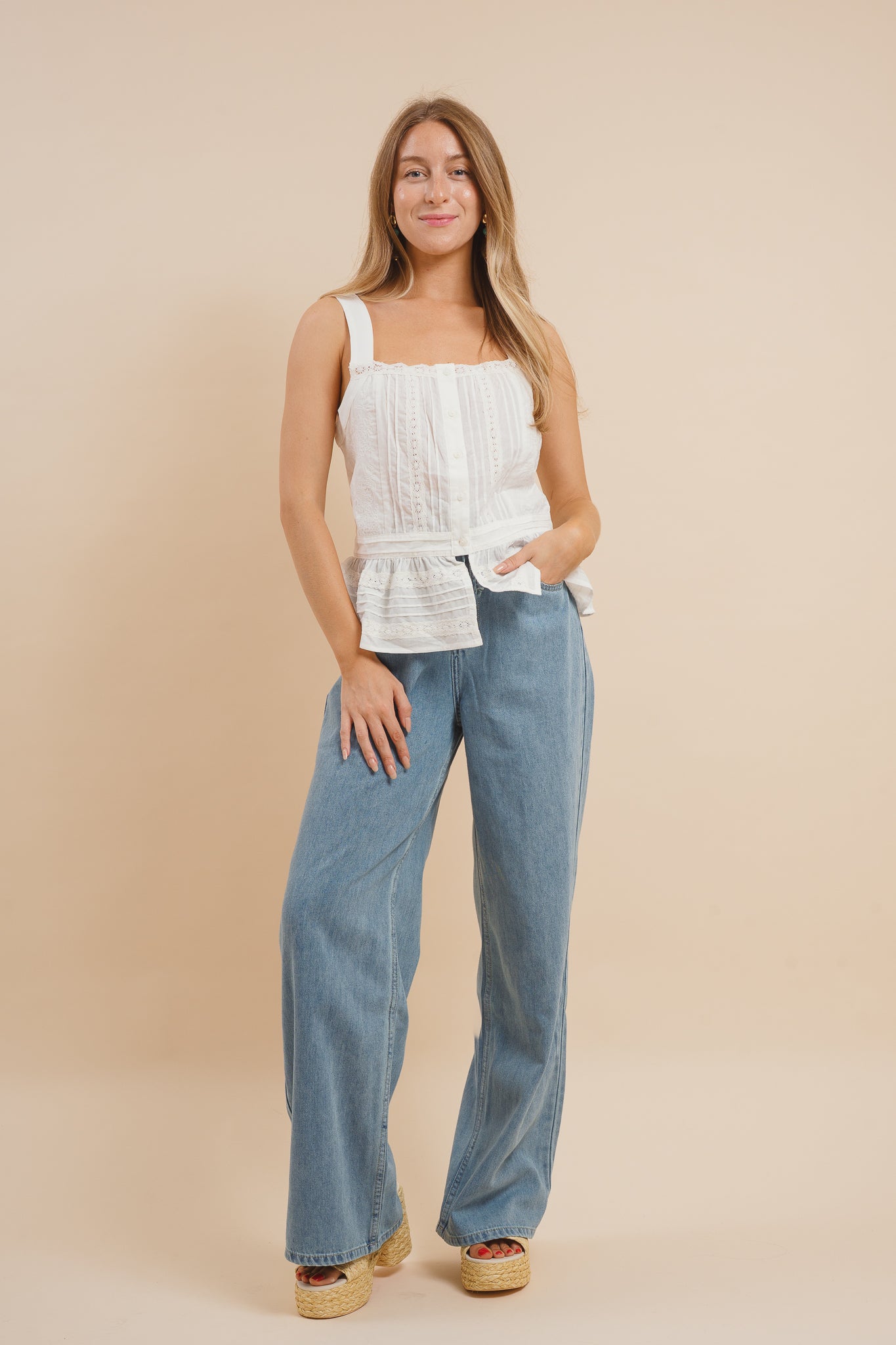 Embrace effortless summer charm in this breezy sleeveless peplum top, featuring a square neckline and delicate flower lace embroidery for a touch of romance. Crafted from airy cotton-rayon voile, it showcases double-scallop ruffles, a see-through center-front lace trim, finished with a button-front closure for a feminine and flattering silhouette.